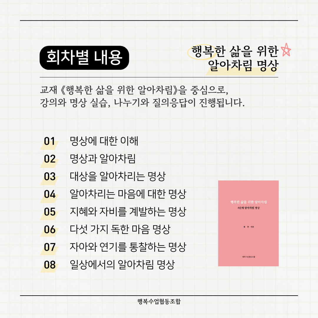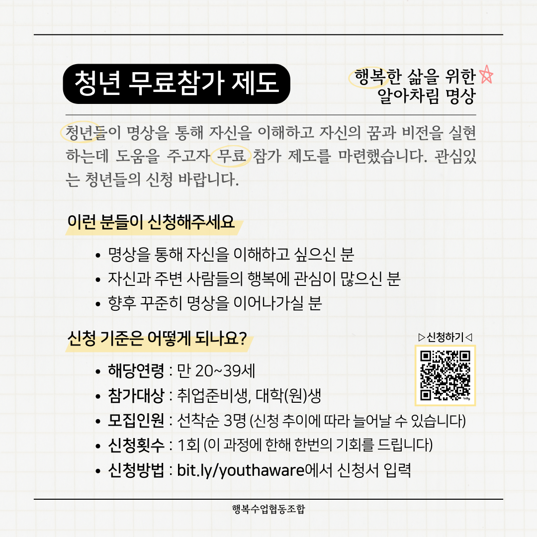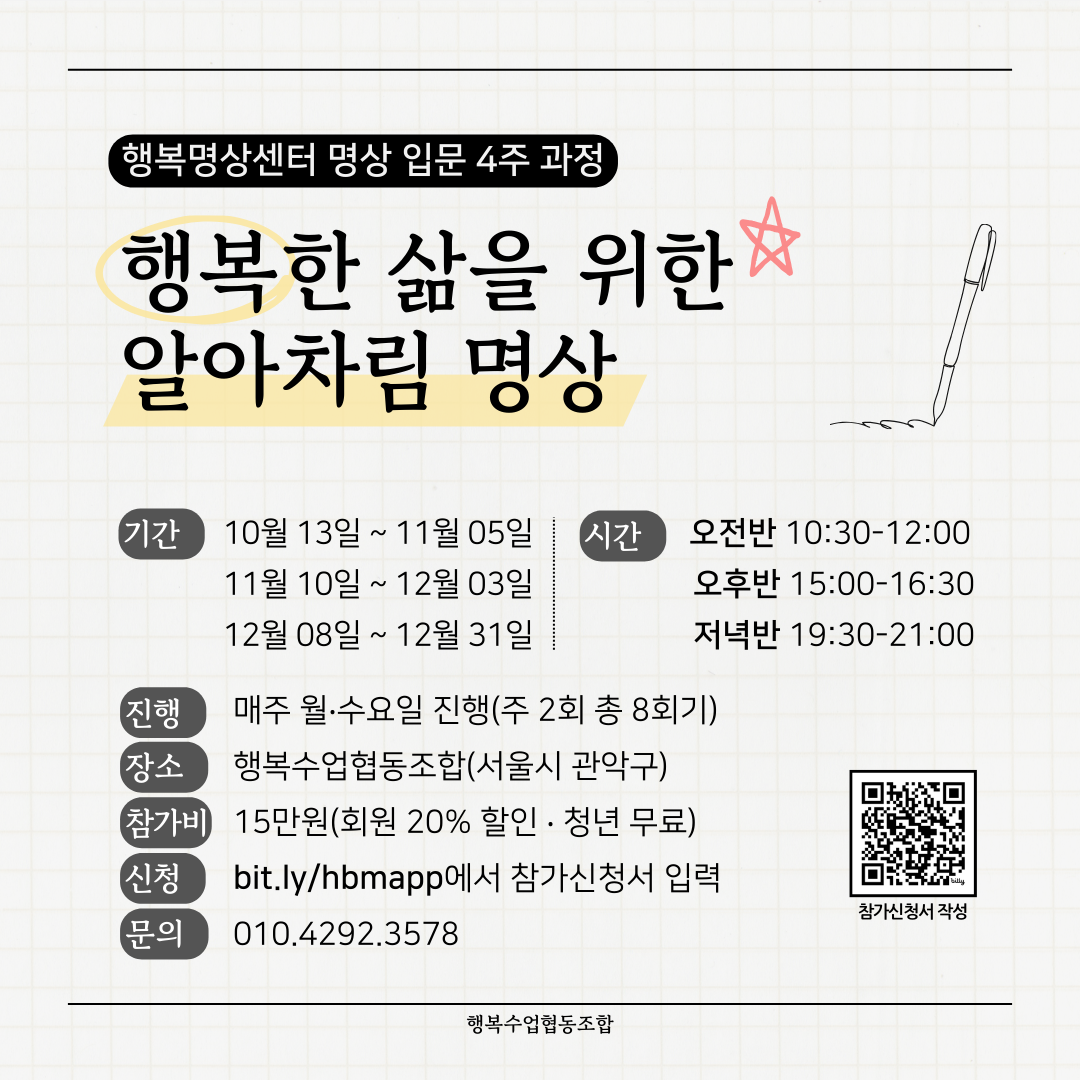 행복한 삶을 위한 알아차림 명상 ● 상세안내 : cafe.naver.com/happyclassmc/4450 ● 참가신청 : bit.ly/hbmapp