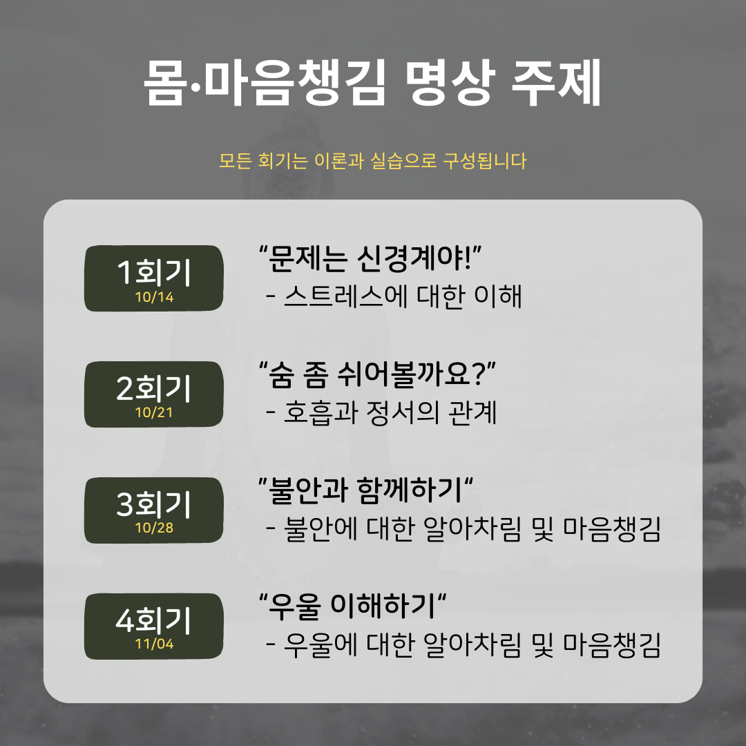 몸 마음챙김 명상 ● 상세안내 : cafe.naver.com/happyclassmc/4445 ● 참가신청 : bit.ly/bmmedi |