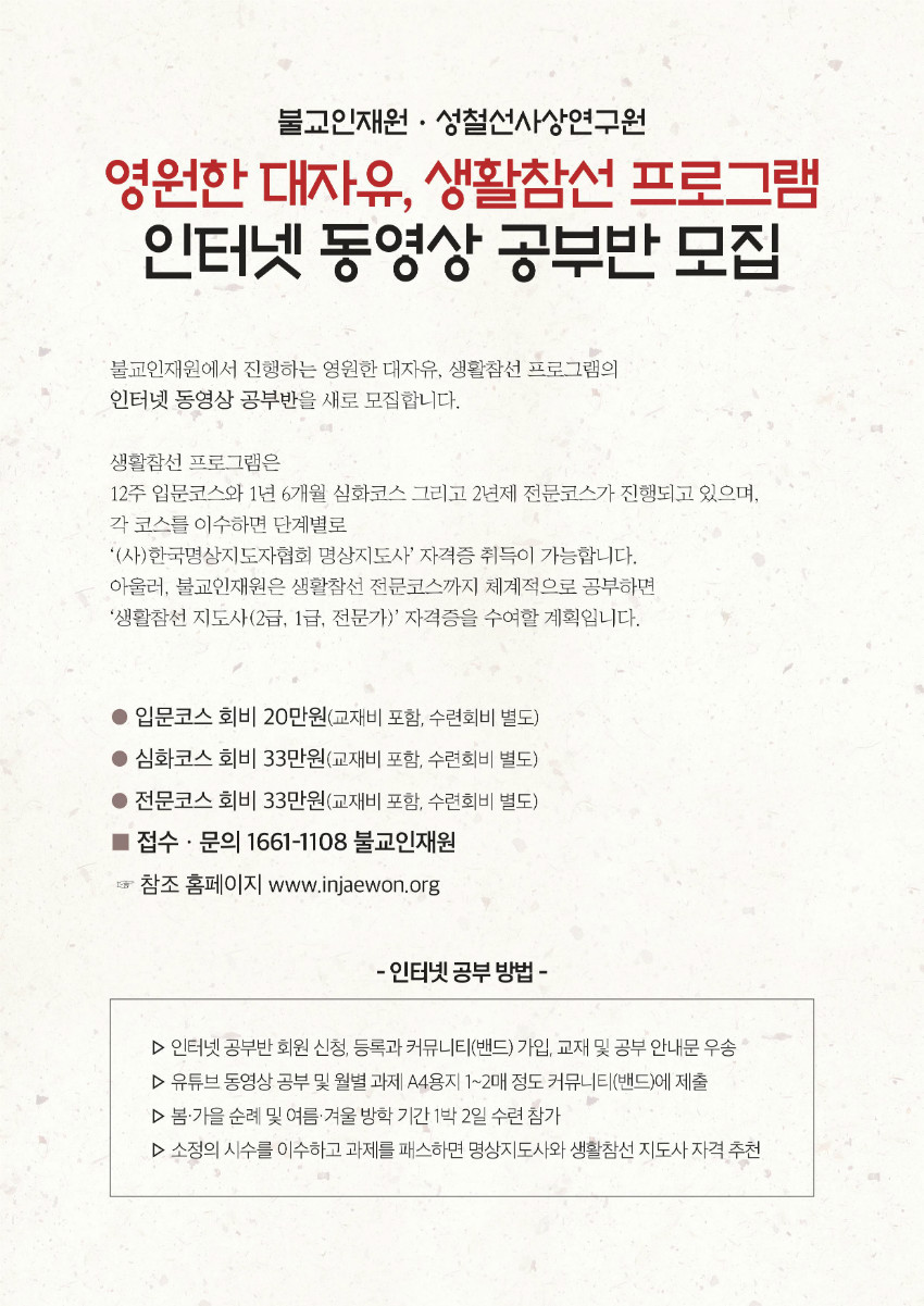 가을학기 생활참선(입문, 심화, 전문코스) 안내